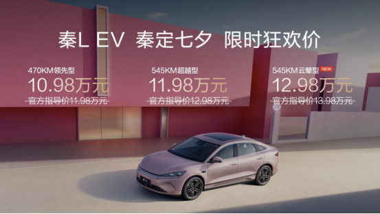 秦L EV云辇型搭载了云辇-C智能阻尼车身控制系统和TBC高速爆胎稳行系统两大超级“神装”,七夕宠粉价12.98万元。同时,秦L EV全系价值重塑,推出“秦定七夕 限时狂欢价”,即日起至9月30日,全系车型限时售价10.98——12.98万元。